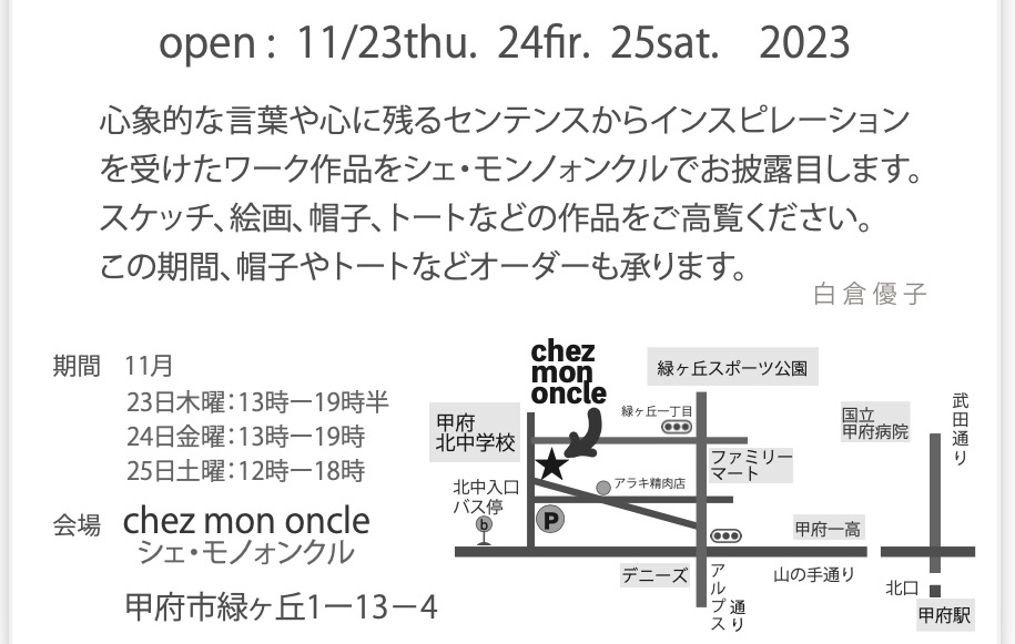 ★駐車場スペースに限りがございます。車でご来場時はどうぞご一報ください。